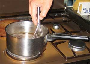 Ψήστε σε μέτριο φούρνο (180°) για 30 έως 40 λεπτά μέχρι να ροδίσει. Σιρόπι: Δέκα περίπου λεπτά πριν τελειώσει το ψήσιμο, βάλτε τα υλικά για το σιρόπι στη φωτιά και αφήστε το να βράσει για πέντε λεπτά (φοτό 2,3 : το σκούρο χρώμα του σιροπιού στη φοτό προέρχεται από τη μαύρη ζάχαρι). |