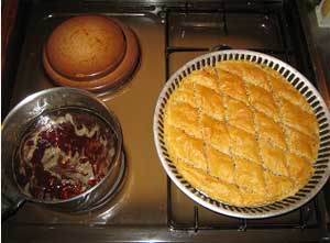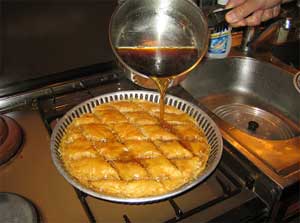 Ρίξτε το ζεστό σιρόπι στον μπακλαβά μόλις τον βγάλετε από τον φούρνο (φοτό 4) και αφήστε τον να κρυώσει. |